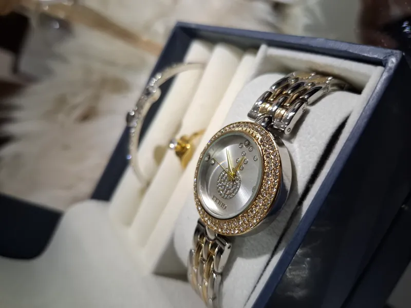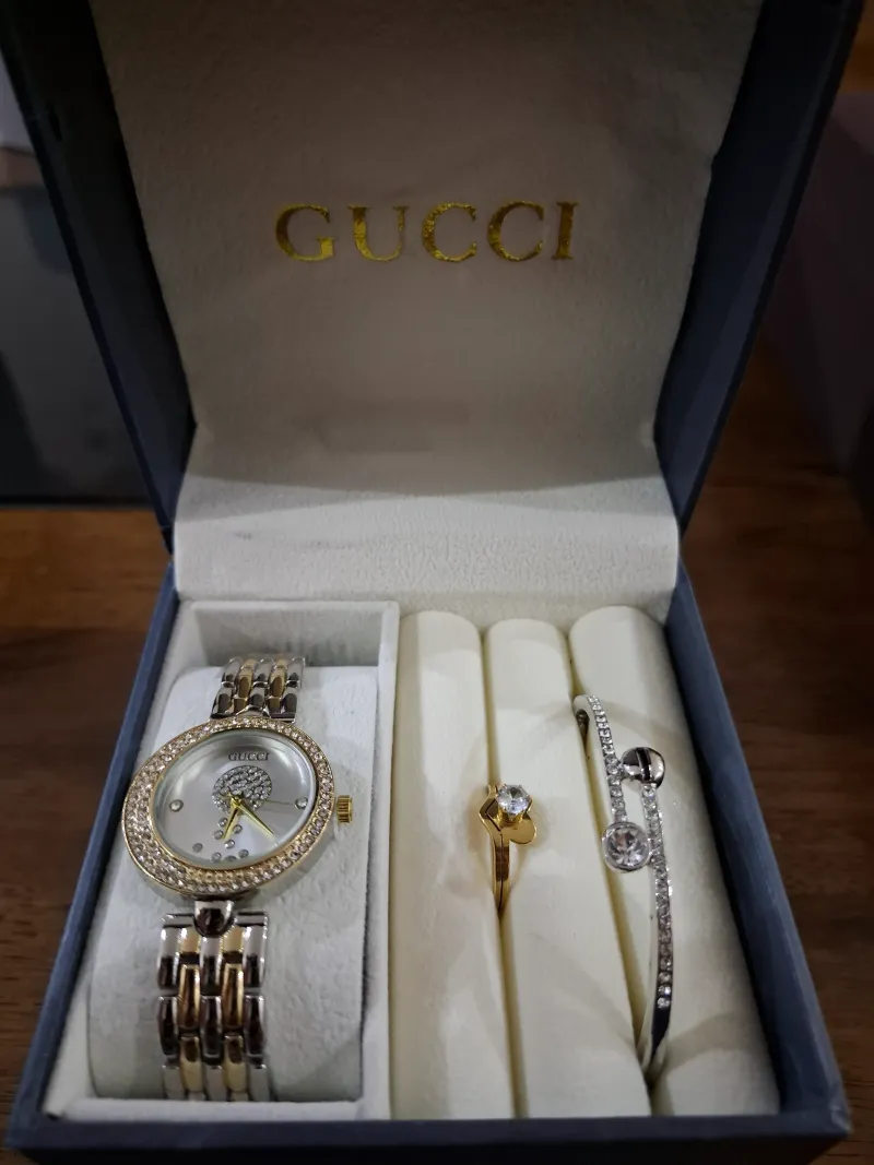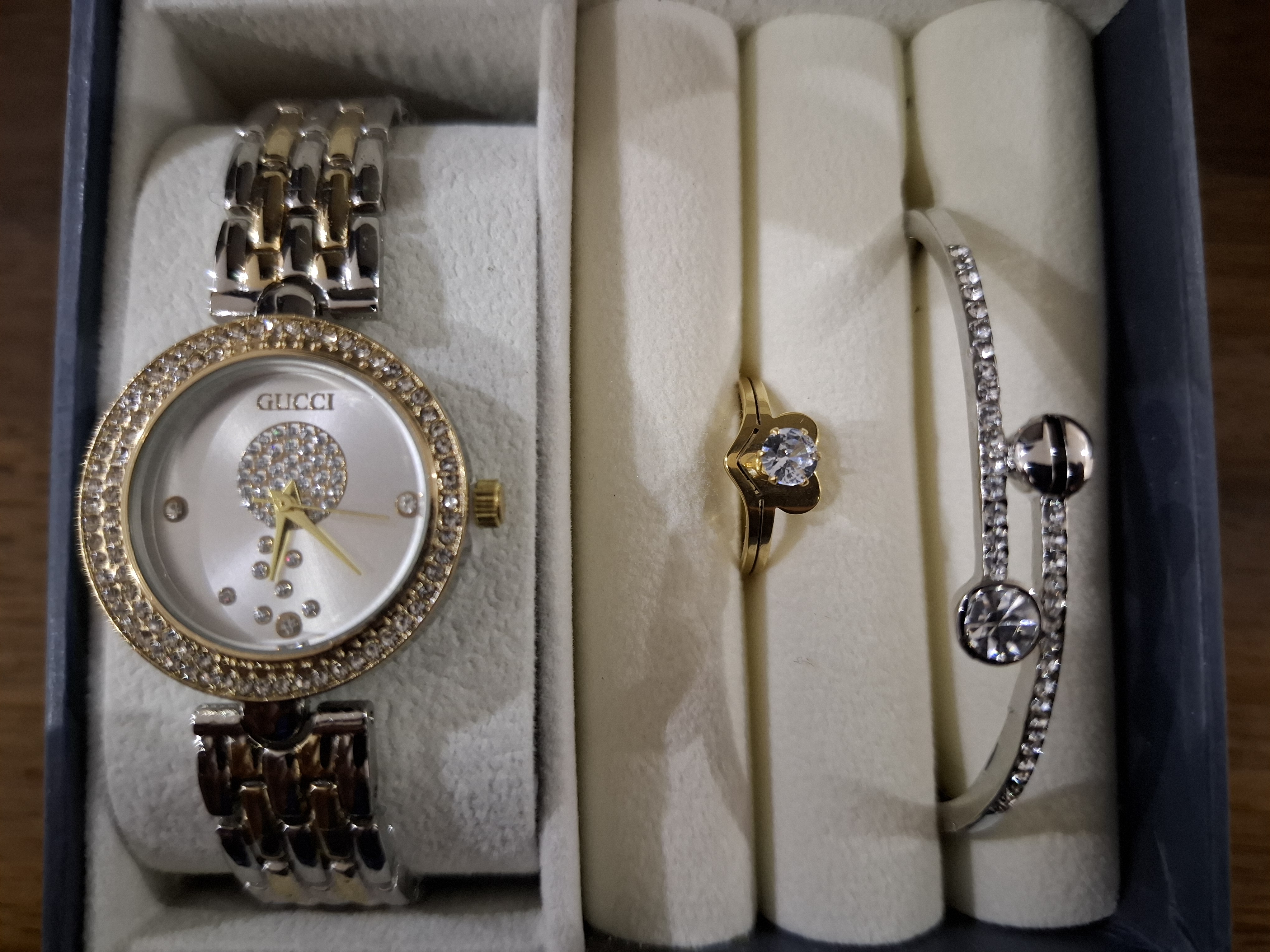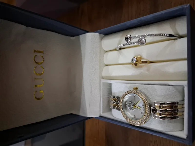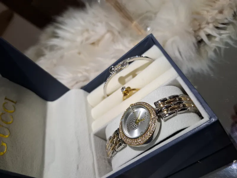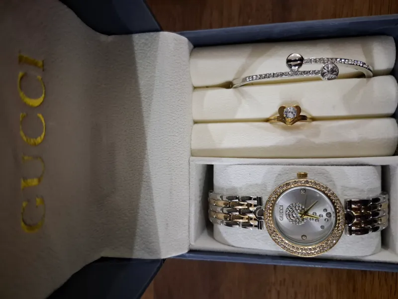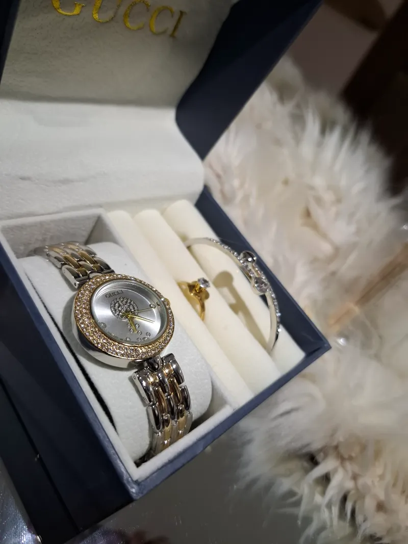 تأتي الساعة مع خاتم بتصميم قلب وسوار فاخر، مما يمنحك مجموعة متكاملة من الأناقة والتميز.